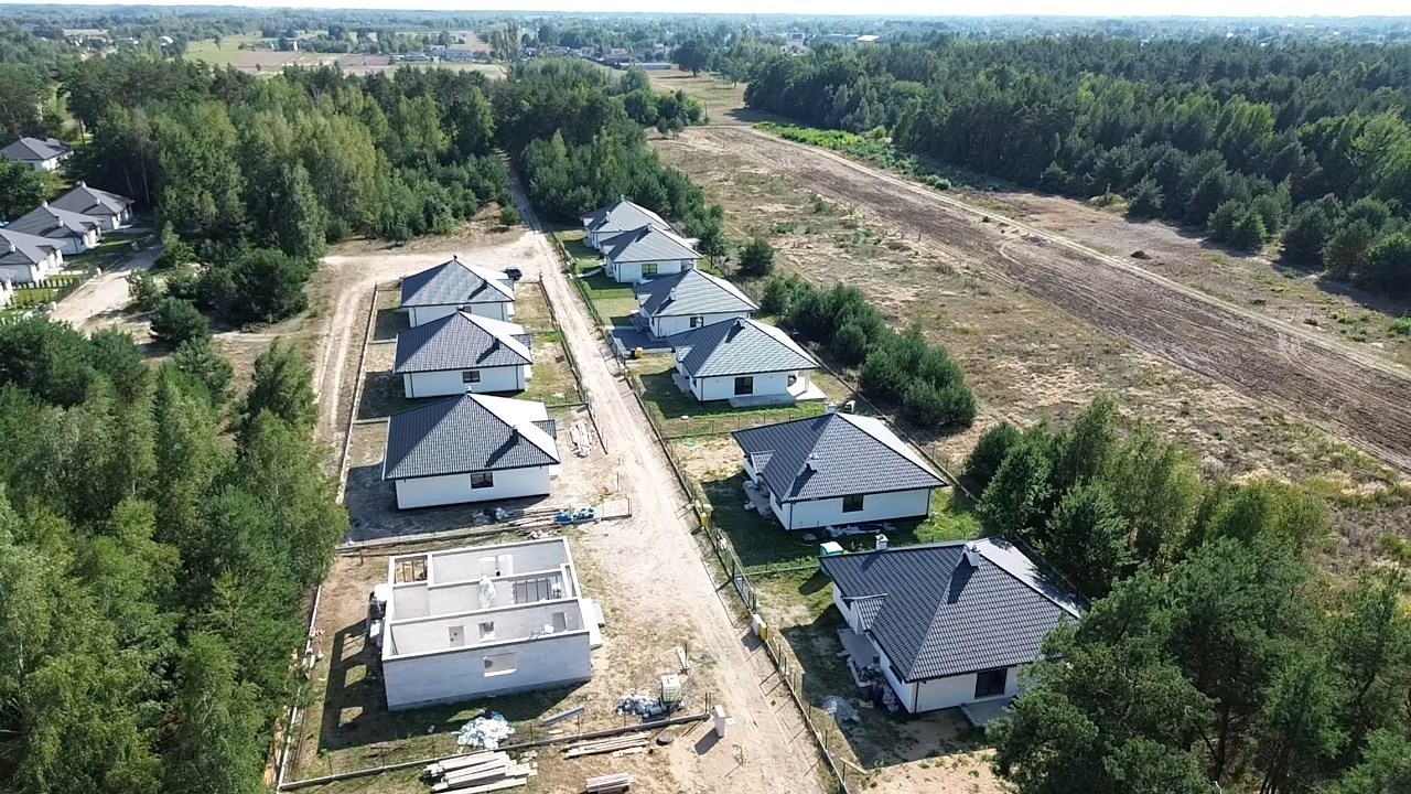 Dom położony w cichej okolicy, otoczony zielenią i nową zabudową jednorodzinną blisko lasu.