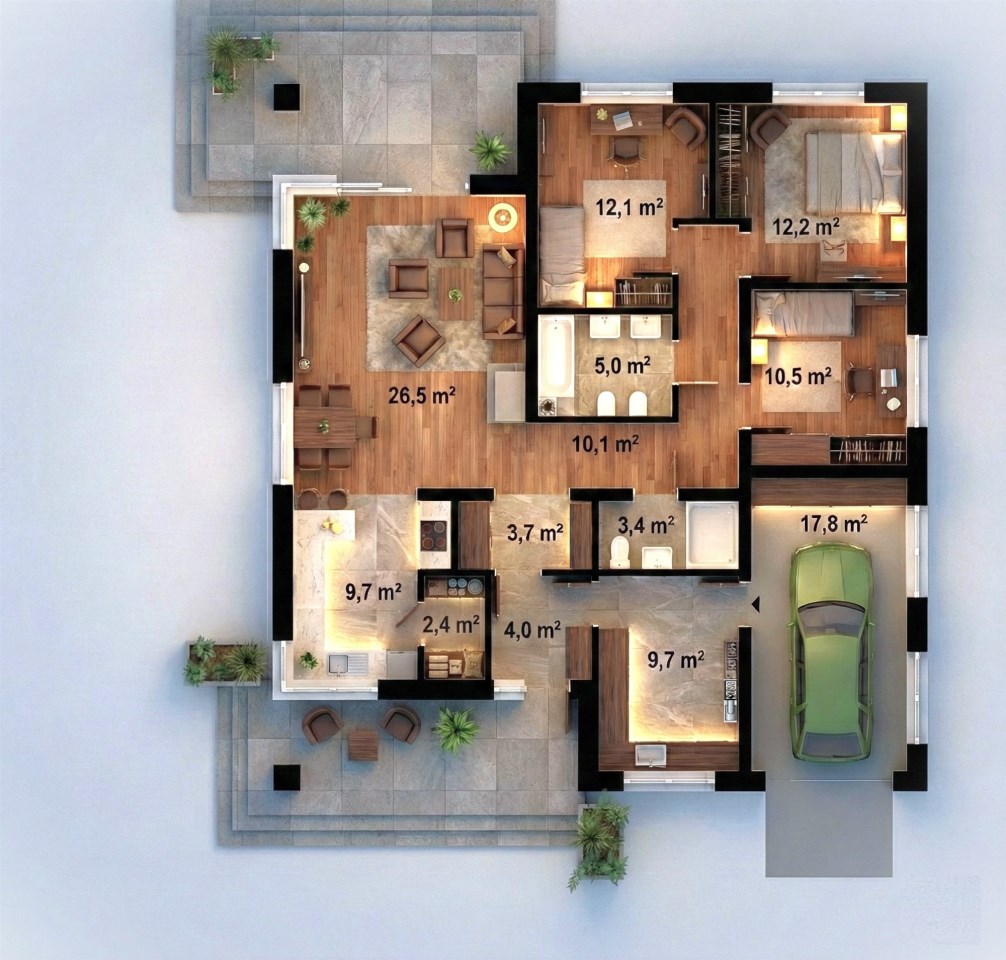 Duży salon z wyjściem na taras, kuchnia, 2 x łazienka, 3x sypialnia, wiatrołap i komunikacja z miejscami na szafy wnękowe, garaż, kotłownia / pom. gospodarcze.