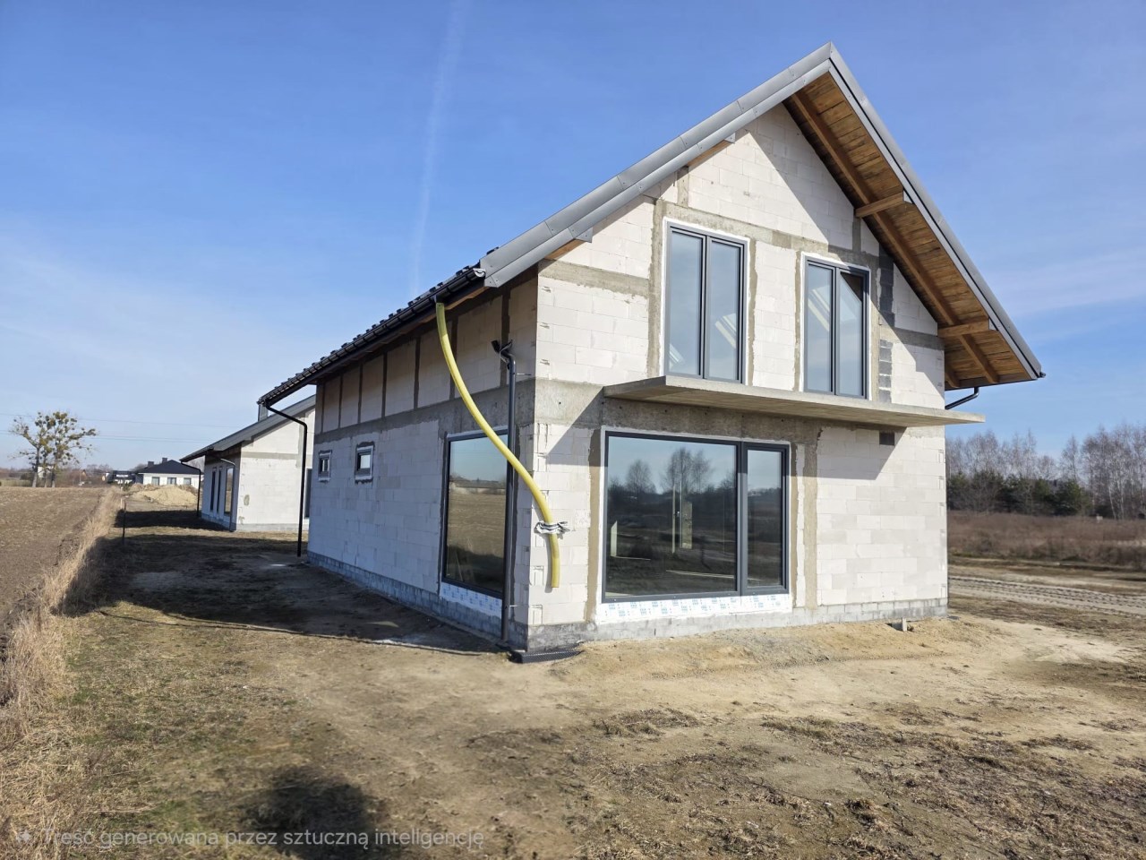Budynek został wykonany z gazobetonu, ze stropem oraz dużymi nowoczesnymi przeszkleniami okiennymi, które podkreślają współczesny charakter domu i zapewniają dużo naturalnego światła.