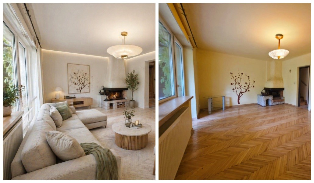 Na parterze znajduje się przestronny salon z kominkiem, kuchnia, jadalnia, przedpokój oraz WC. Na piętrze z kolei mieści się duży salon z balkonem (5 m długości), dwie sypialnie oraz łazienka z WC. Dodatkowym atutem jest duże poddasze z ogromnym potencjałem aranżacyjnym.