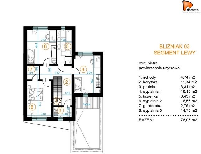 Piętro to strefa prywatna domowników – zaplanowano tu trzy sypialnie, w tym jedną z garderobą, łazienkę, pralnię, korytarz oraz schody. Układ zapewnia komfort, prywatność i wygodę dla całej rodziny.