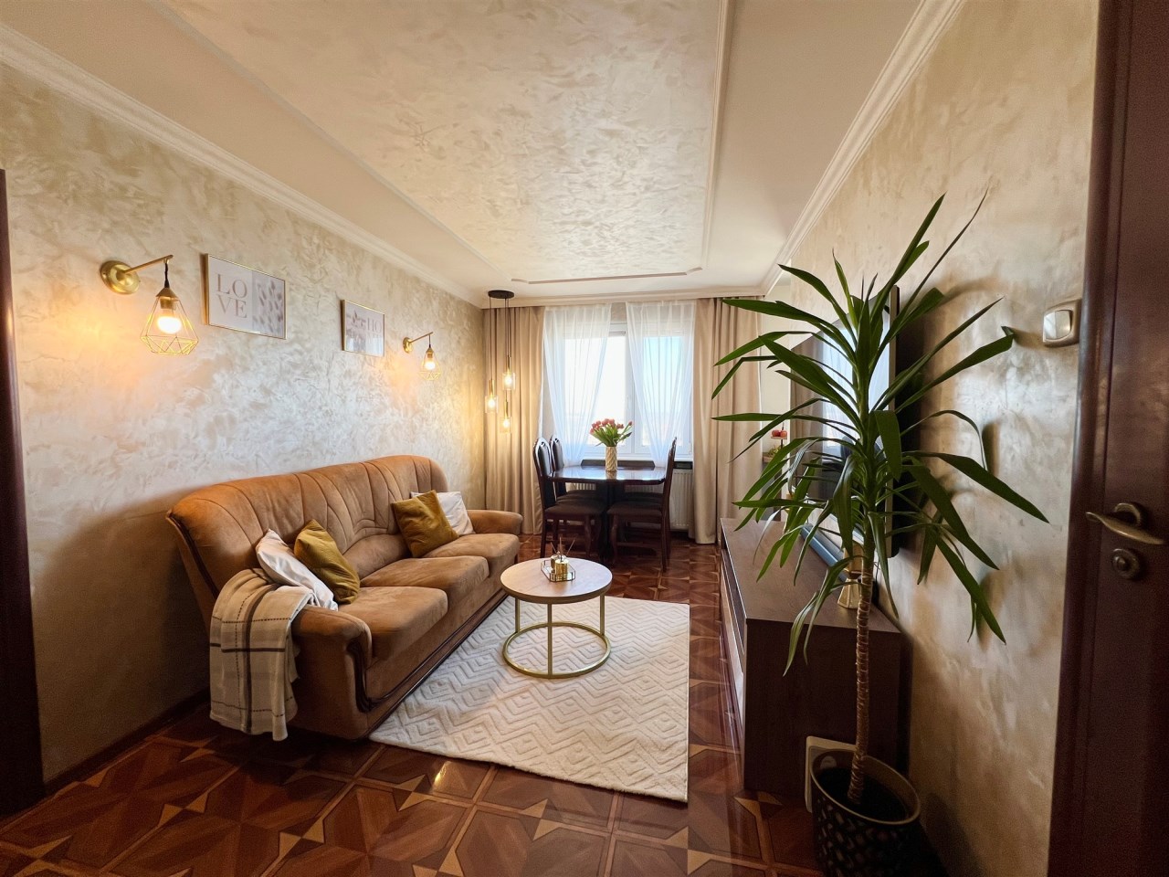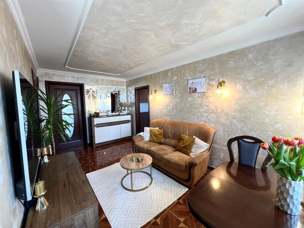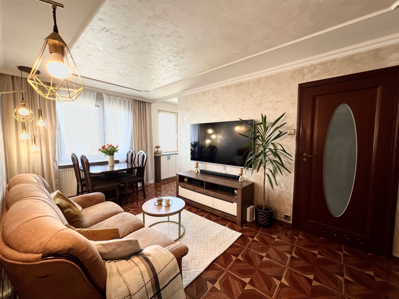 Centralnym punktem mieszkania jest przestronny salon z częścią wypoczynkową oraz miejscem na stół jadalny. Okna zapewniają świetne oświetlenie, a eleganckie wykończenie i spójna kolorystyka tworzą przytulny, ponadczasowy klimat.