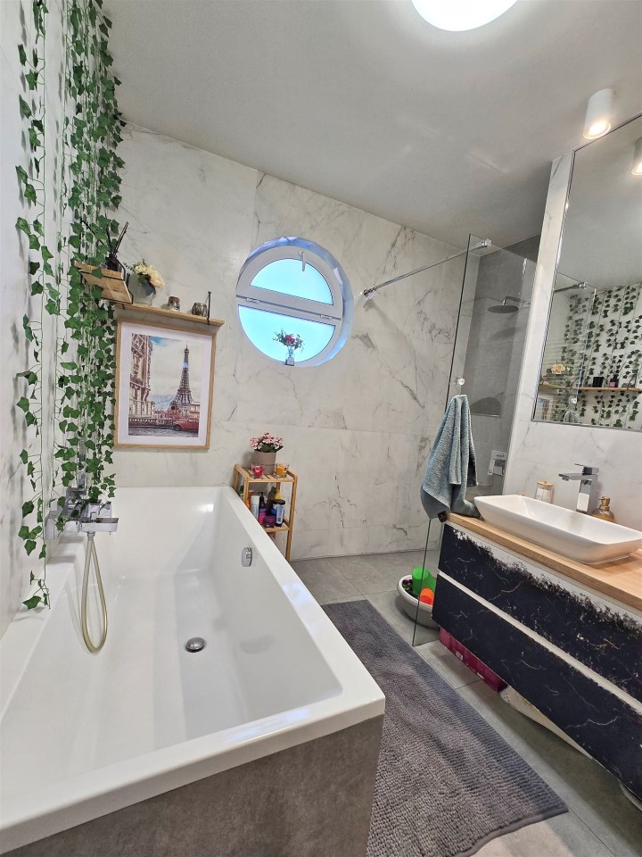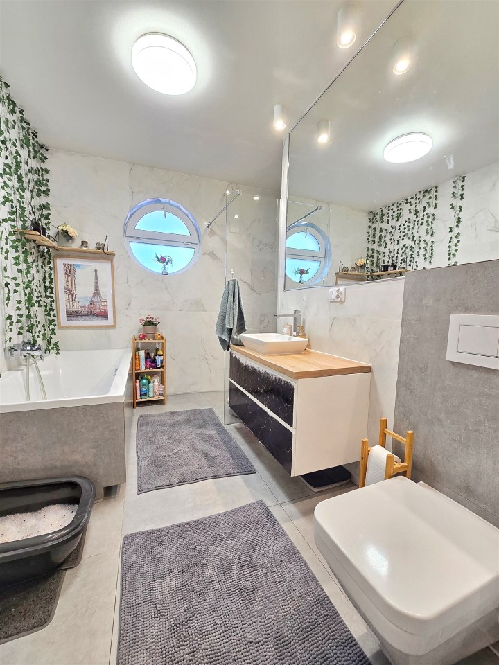 Łazienka: Komfortowy pokój kąpielowy wyposażony zarówno w wannę, jak i prysznic z odpływem liniowym, WC oraz umywalkę (glazura i terakota).
